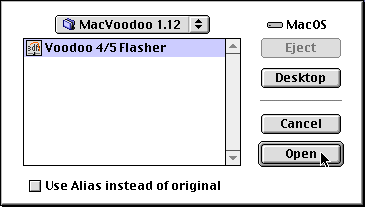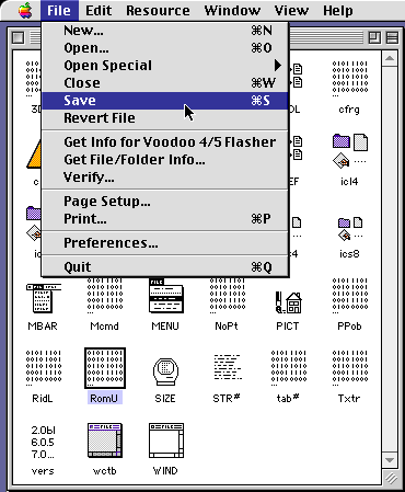 While still in ResEdit, choose "Open…" from the file menu and navigate to the "Voodoo 4/5 Flasher" control panel you created in step 1.