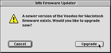 With the release of version 1.12 of the Macintosh Voodoo 4/5 drivers, 3dfx included a "hidden" way to force a firmware update. Prior to this version, the 3dfx MacTools control panel (actually it’s an application) would check the version of the firmware on the card whenever it was launched. The firmware is compared against the "RomU" resources stored in the 3dfx MacTools control panel. If the version in the resources was found to be newer than what is currently in the card, you are given the option of updating the firmware.